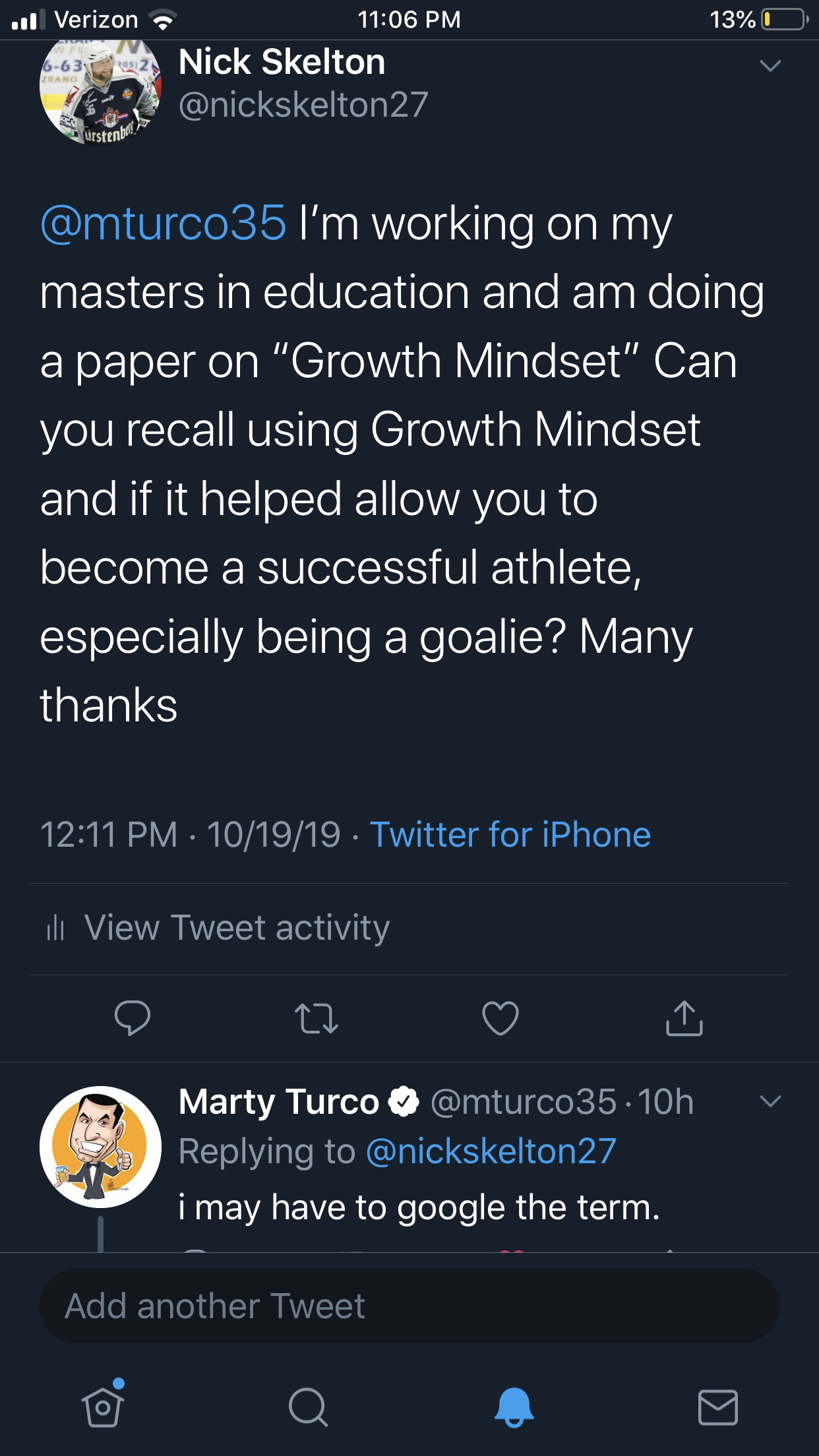 I asked if they have ever used Growth Mindset and if they could recall a time they did. As of now, I have received only one response and that was from retired goalie Marty Turco. Turco spent 11 years in the NHL and played for the Dallas Stars, Chicago Blackhawks and Boston Bruins. Famed NHL analyst and former Coach Don Cherry named Marty Turco as, “The smartest goalie in the NHL.” (Wikipedia Marty Turco) When Marty responded to the tweet, he said, “I may have to Google the term.” That made me scratch my head and wonder if the athletes I asked are too old for such a young theory. I decided to ask a 15-year-old goalie I used to coach if he knew what Growth Mindset was, and he did because his father had shown him a video about it. I asked another youth goalie and he, like Marty Turco, wasn’t too sure what Growth Mindset is. With that being said, there looks like there is a lack of information regarding Growth Mindset in youth ice hockey and in the ice hockey world itself.